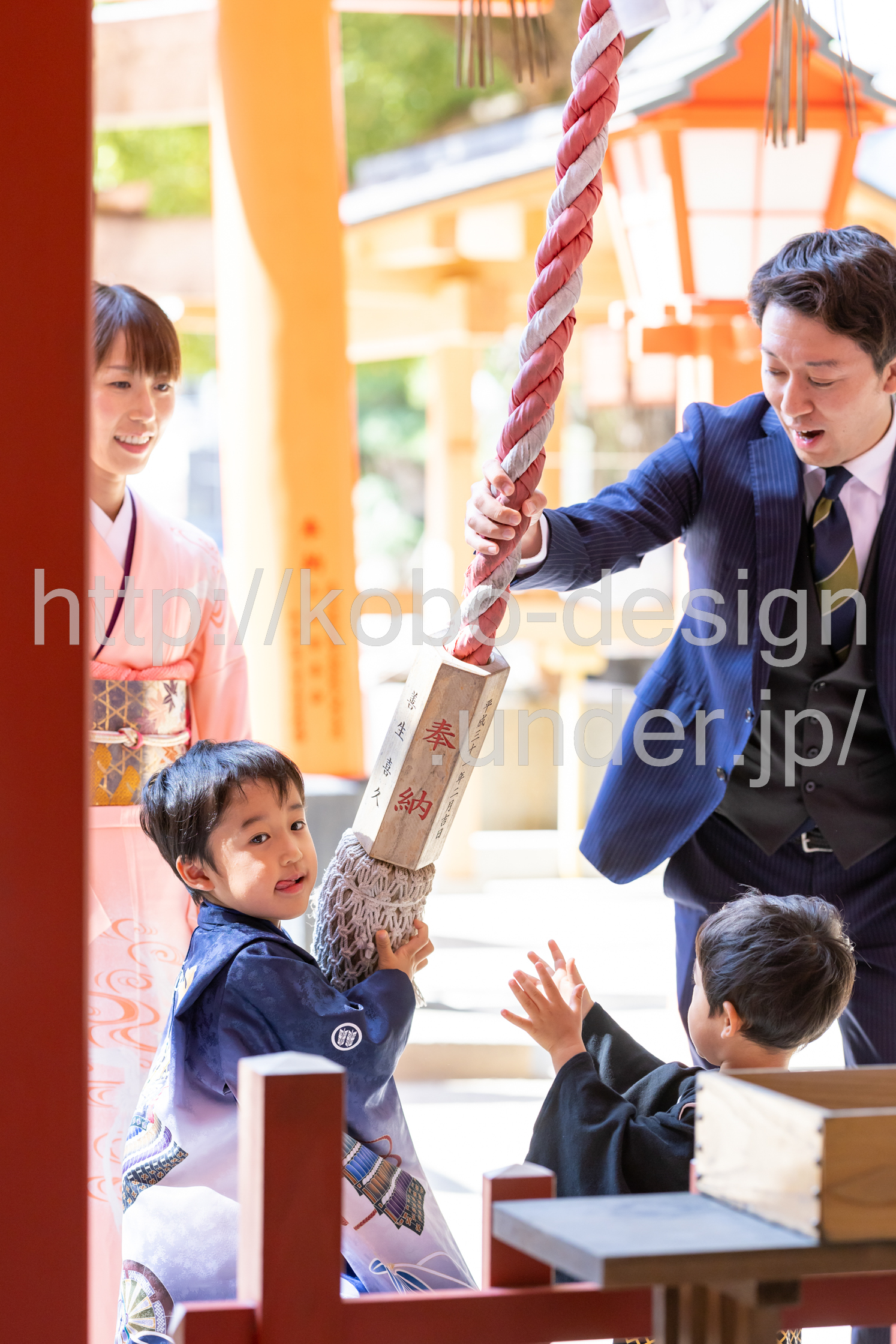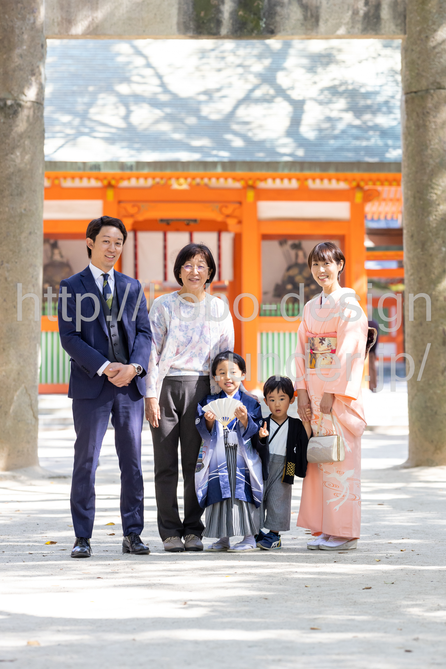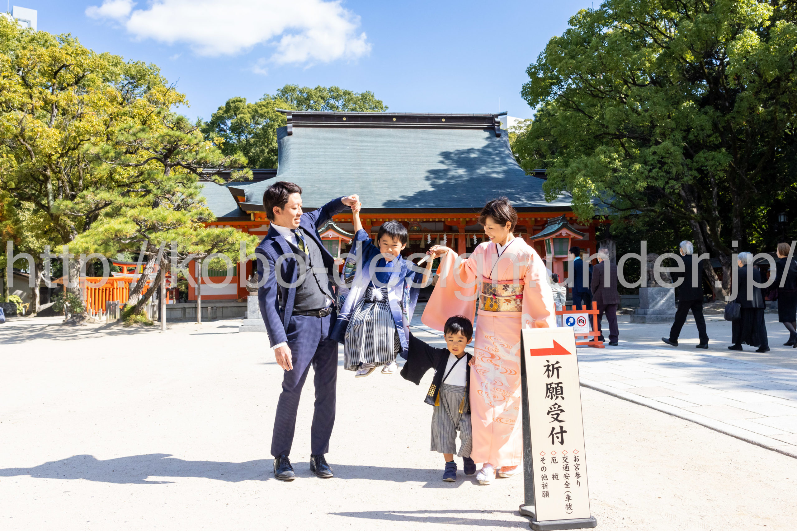 kobo-Design ではご希望の場所で御希望の撮影を承る出張カメラマンサービスになります。 七五三、お宮参り、餅踏み、など御子様の行事に同行し御依頼時間内の撮影を致します。集合写真、お爺さんお婆さんとお孫さんでのカット、御夫妻とお子さんでのカット、祈願中の撮影が可能な場合は祈願中のカット、あとは御子様の自然な表情など時間内枚数制限なしで撮影致します。 まずはお気軽に問い合わせ下さい。